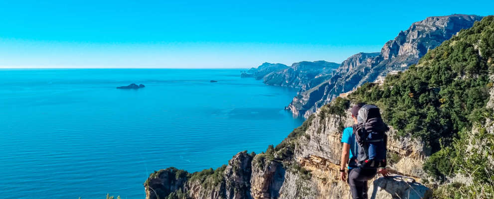 You’ll follow red-and-white waymarks along balcony-like ledges, passing caves and shepherds’ shelters, with constant birds-eye views of the Sirenuse (Li Galli) islets and – on clear days – Capri.