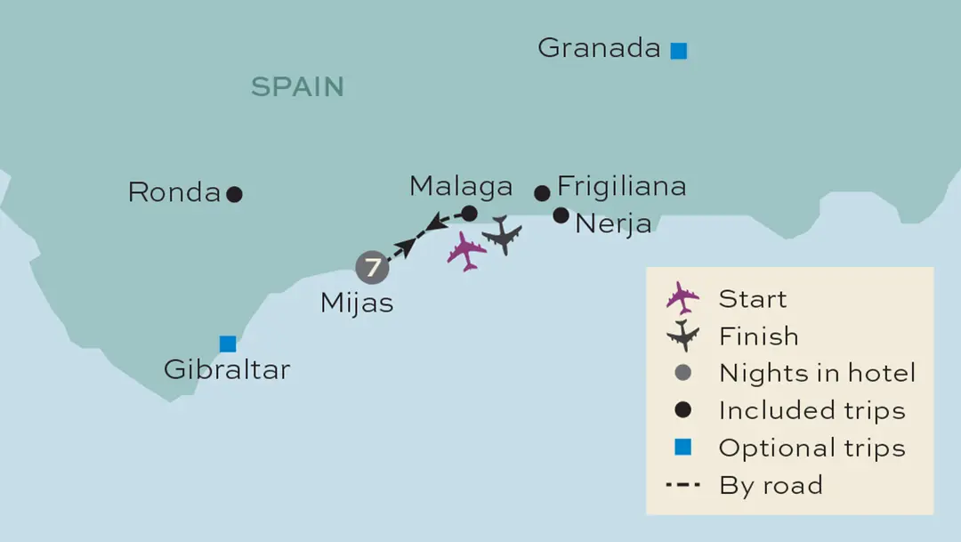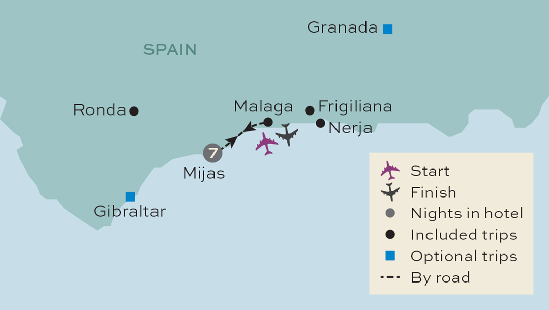 Meals included: B,DWe are off to the beautiful hilltop village of Frigiliana today, situated in the foothills of the Almijara Mountains, and is the first stop on our included excursion. Easily explored on foot, this picturesque village is a maze of cobbled streets and its historic centre has a distinctively Moorish appearance. We'll have time to explore its winding alleyways before heading onto Nerja, with its lovely sandy beaches and hidden coves. Once a sleepy fishing village, its old quarter remains virtually unchanged, with narrow winding streets lined with whitewashed houses and wrought-iron terraces overflowing with fragrant geraniums.