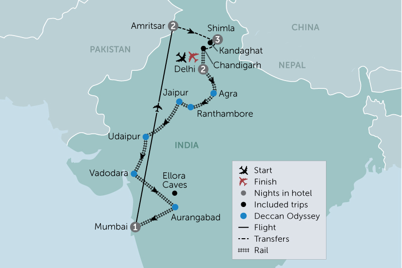 The ultimate way to explore India's Golden Triangle, Rajasthan, Amritsar and Shimla. We fly to Delhi, where we will start our explorations with a tour of New and Old Delhi, before joining the incredible luxury heritage train - Deccan Odyssey. Our 2025 departure is exclusively chartered for Just You in celebration of our 25th anniversary! We stay on board for 7 nights, and en-route experience Agra, Ranthambore, Jaipur, Udaipur and Ellora Caves, its the perfect way to tour without packing and unpacking. We end in Mumbai, India's largest and most vibrant city, home of Bollywood and much more, then travel onto Amritsar to see the Golden Temple by night and day and lastly explore the hill station resort of Shimla.
