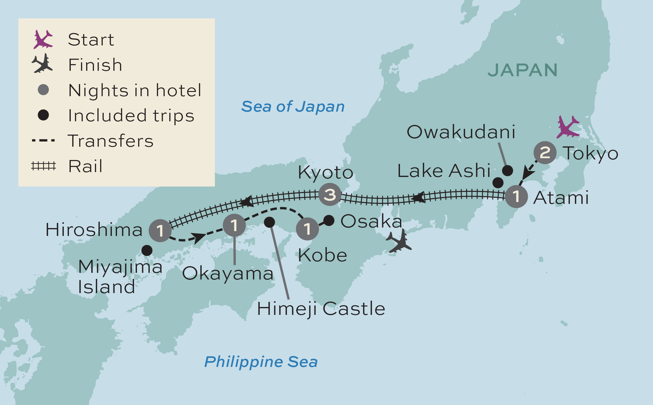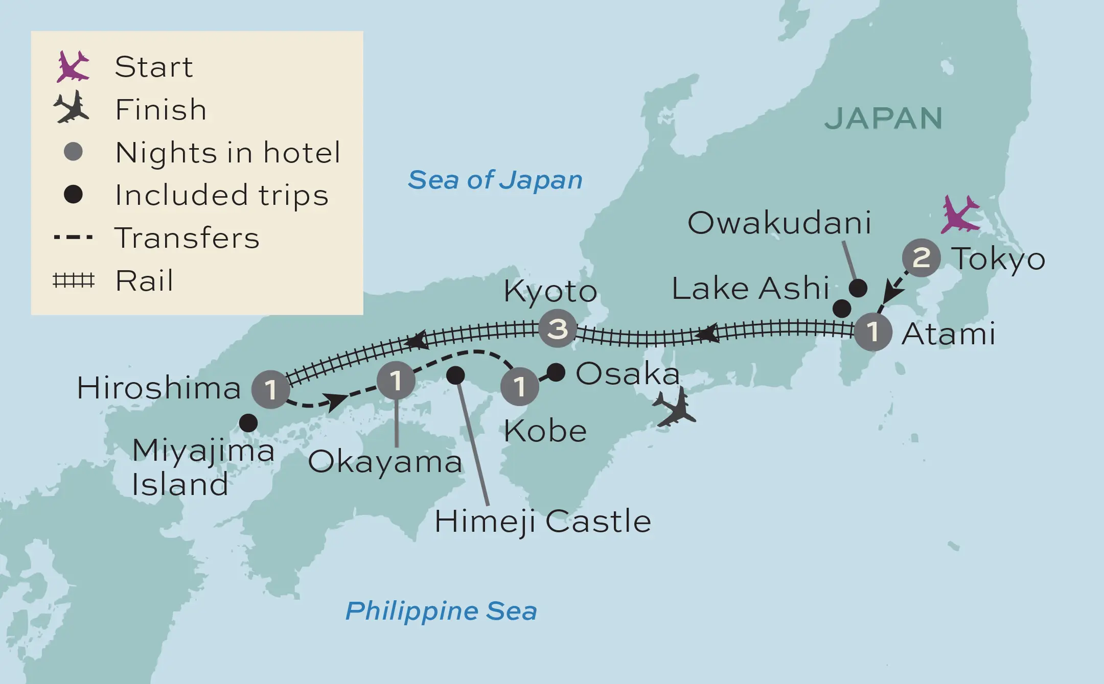 This unforgettable adventure to enigmatic Japan begins in the capital, Tokyo. Here you will take in stunning views from the Observation Deck of the Tokyo Tower and experience an authentic rickshaw ride. Next, you'll discover the natural beauty of Mount Fuji and enjoy a cruise on Lake Ashi before travelling by Bullet Train to Kyoto. You'll stay here for three nights and will visit the famous sake brewing district. From here you will also visit the historic city of Nara and Osaka, where you will stop to take photographs of beautiful Osaka Castle. In Hiroshima, you'll take in Miyajima Island and see poignant sights dedicated to the nuclear bombing of the Second World War, before spending the last night of your holiday in the pretty port city of Kobe.