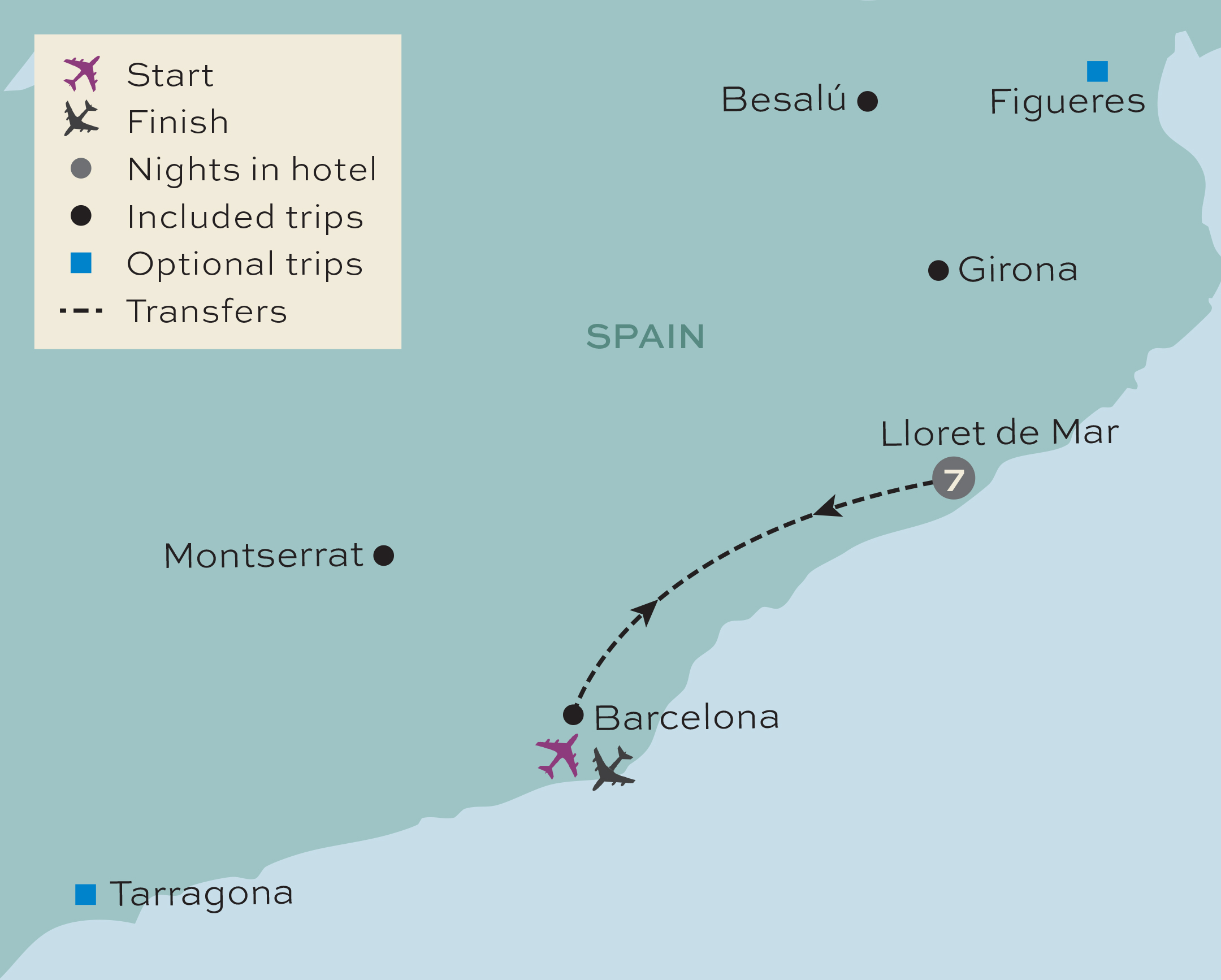 Today you'll fly to Barcelona and on arrival we'll transfer you to your hotel in Lloret de Mar, on Spain's lovely Costa Brava. After time to settle into your room, join your fellow travellers for a welcome drink before dinner this evening. Meals included: D